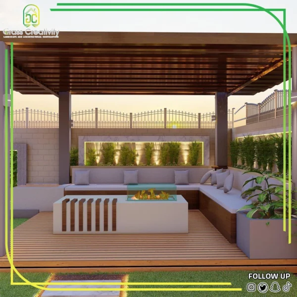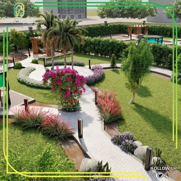 تم تنفيذ المشروع بأسلوب يجمع بين العصرية والطابع الطبيعي من خلال تركيب العشب الطبيعي والصناعي وتنفيذ ممرات حجرية بتصميم هندسي أنيق وزراعة أشجار الزينة والنباتات الموسمية إضافة إلى تركيب أنظمة الري والإضاءة الحديثة التي تضفي على المكان لمسة راقية وجمالًا استثنائيًا
