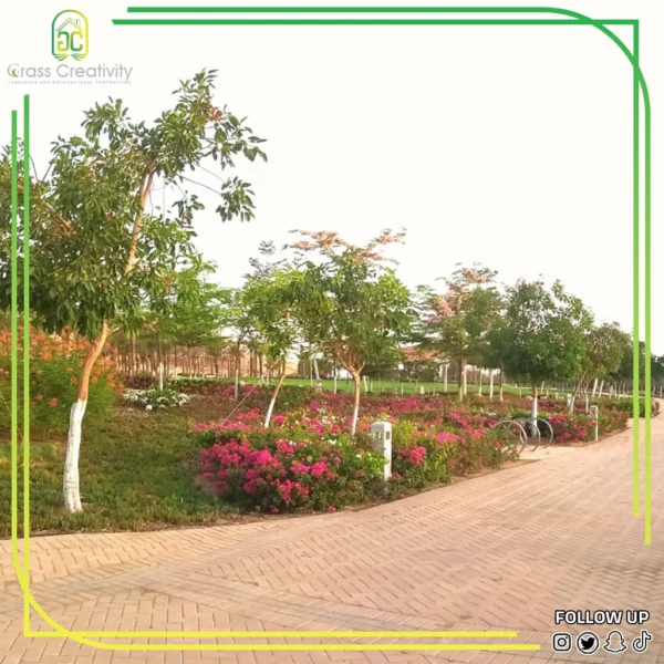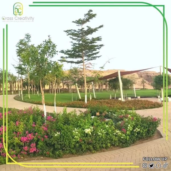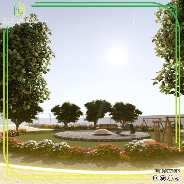 تم في هذا المشروع تصميم وتنفيذ مساحات خضراء متناسقة تجمع بين العشب الطبيعي والعشب الصناعي، مع إضافة عناصر جمالية مثل الممرات الحجرية والنوافير الديكورية والإضاءة الجانبية الحديثة، لتمنح المكان مظهرًا أنيقًا وحيويًا على مدار اليوم